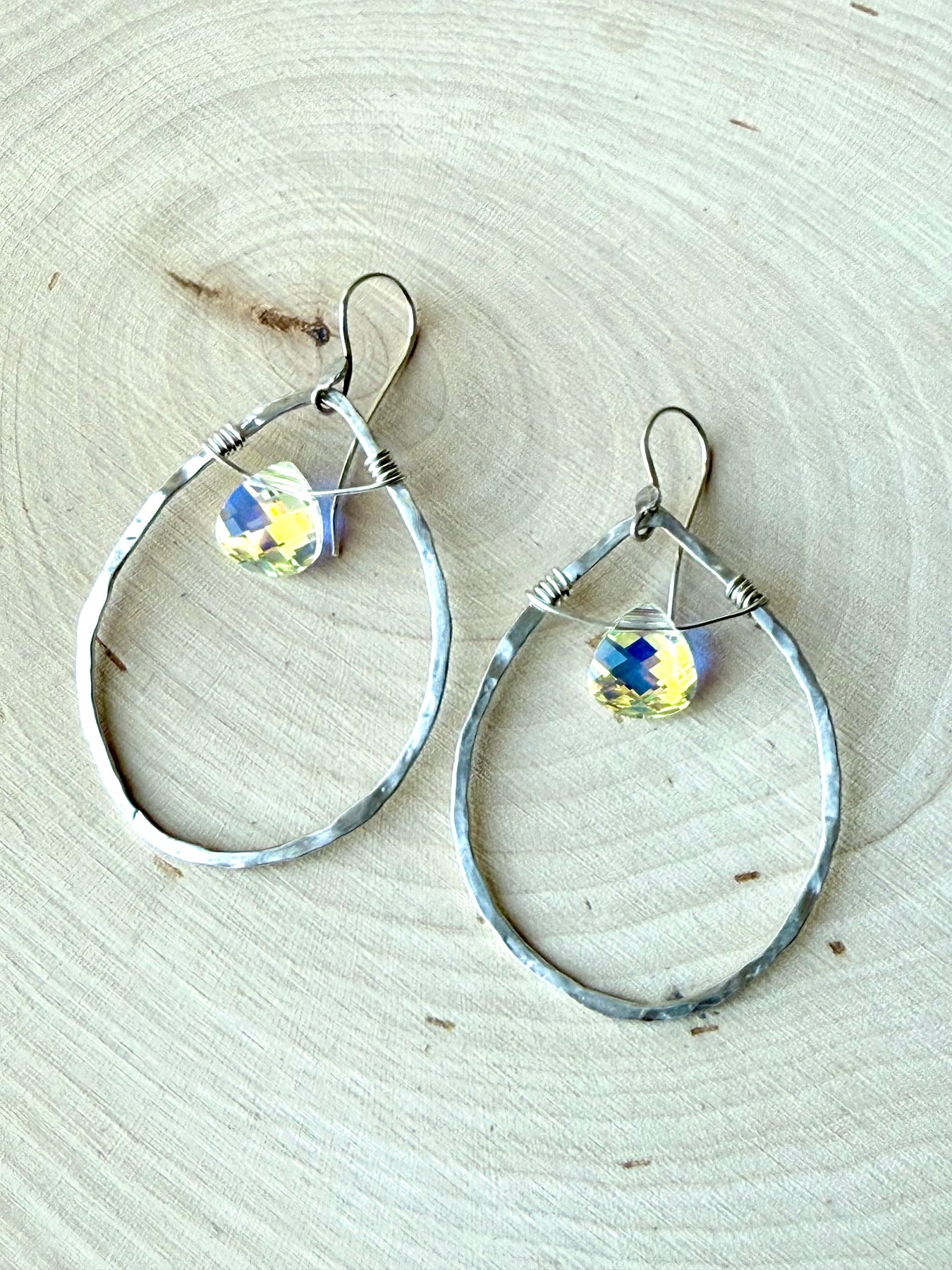 The clear Aurora Borealis crystal shifts magically in the light, flashing subtle rainbows, silvery fire, and unexpected color with every movement. The slightly teardrop-shaped hoop mirrors the crystal within, creating a graceful balance of form and flow.